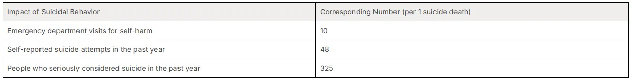 The scale of suicidal ideation and attempts is even broader than the number of deaths. The table below illustrates the widespread impact of suicidal behavior based on national survey data.