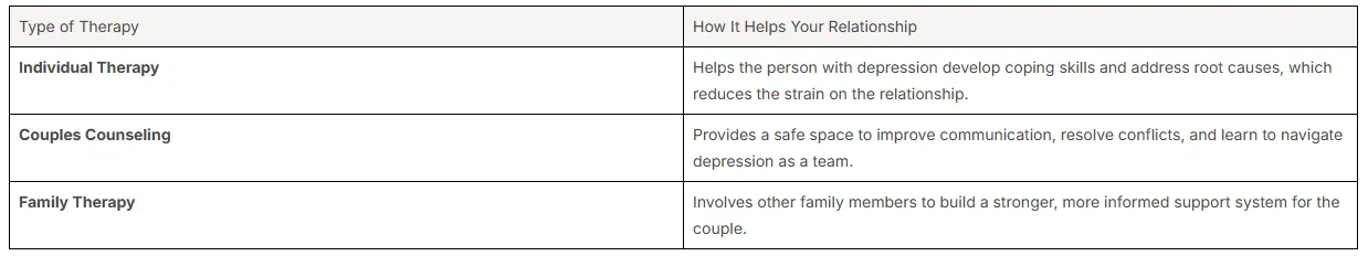 Couples therapy is particularly beneficial, as it gives both partners a chance to express their thoughts and feelings in a mediated space. A therapist can help you understand how depression is influencing your dynamic and teach you healthier ways to interact and support each other.