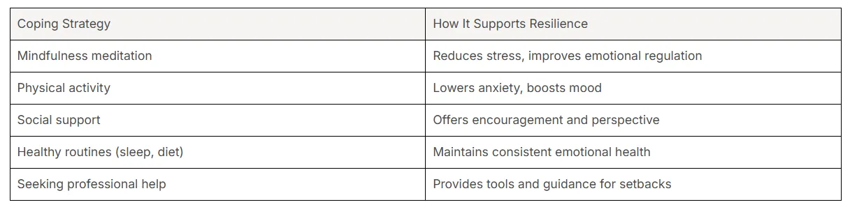 Resilience is fundamental for handling life's inevitable challenges. Emotionally healthy people use coping strategies that protect them during stressful situations, helping them bounce back and grow stronger. Older adults, especially, experience changes that may challenge their sense of purpose, but resilience can be cultivated at any age. Review this table for practical resilience-building strategies: