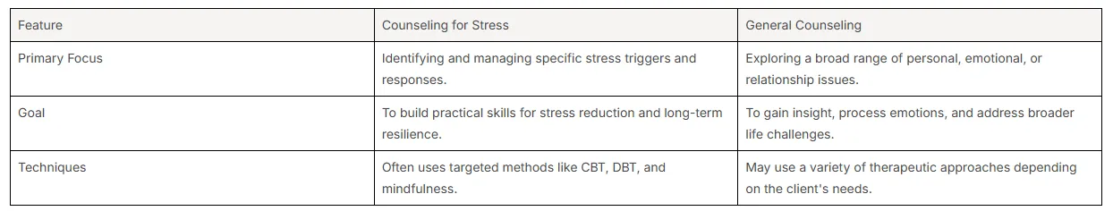 In contrast, counseling for stress management uses specialized approaches to directly target the causes and symptoms of stress. The sessions are structured to help you build a toolkit of practical coping mechanisms specifically for handling pressure and anxiety.