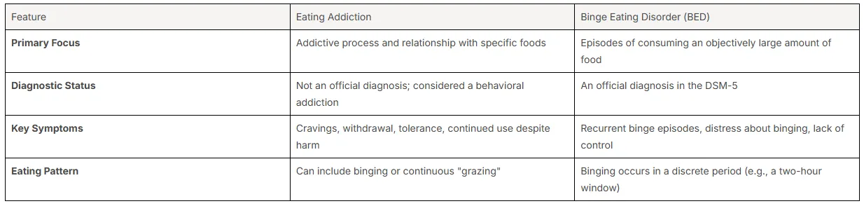A key difference is that BED is defined by episodes of consuming large quantities of food, whereas eating addiction can also include "grazing"—eating continuously throughout the day. Here is a simple breakdown of the distinctions: