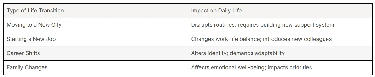 Life transitions bring significant shifts, like moving to a new city, starting a career, or experiencing job loss and the loss of a loved one. These changes have a profound impact on your daily life, often evoking a range of emotions—from excitement to anxiety.
