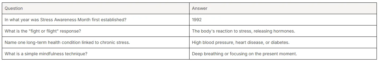 A trivia quiz is a fun and interactive way to boost mental health awareness during Stress Awareness Month. This activity can educate participants about the causes, symptoms, and effective strategies for stress management in an engaging format. It’s a great way to start conversations about employee stress without being too serious.