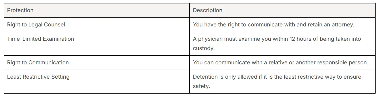 Even in these cases, your civil rights are protected. You must be examined by a physician within 12 hours, and emergency detention is only permitted if specific criteria are met, showing it is the least restrictive means necessary. You have the right to communicate with an attorney and a family member.