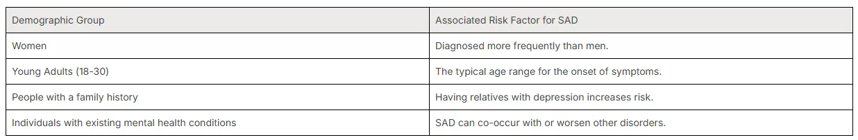 Consulting with mental health professionals is a vital step for anyone, regardless of jejich demographic, who suspects they may have SAD, major depression, or persistent depressive disorder. Here is a breakdown of groups who may be at a higher risk: