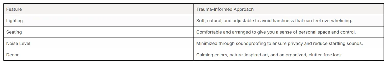 Elements such as soft lighting, comfortable seating, and soundproofing help create a private setting where you can speak freely. Even common areas are designed to be calming rather than chaotic. The use of soothing colors and clutter-free organization helps establish a sense of order and control, which can be very grounding for trauma survivors.