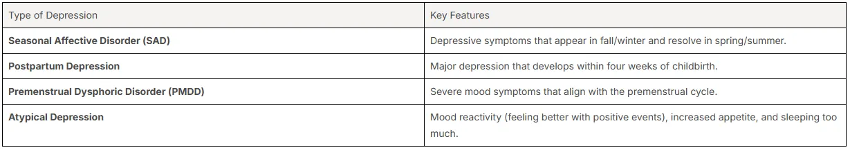 Beyond major depression, several specific forms are linked to particular circumstances or symptom patterns. One well-known type is seasonal affective disorder (SAD), a form of major depression that typically occurs during the fall and winter months when there is less natural sunlight.