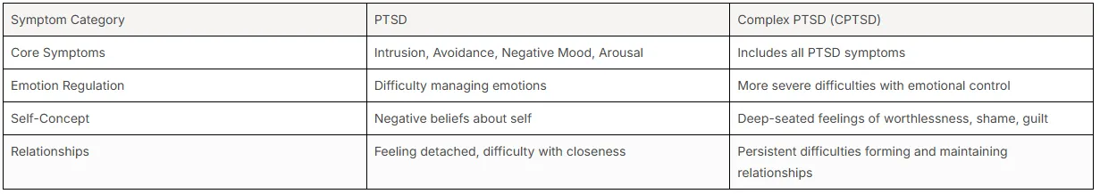 The core symptoms of PTSD are present in CPTSD, but individuals with CPTSD experience additional difficulties. These often relate to self-concept, emotional regulation, and relationships. They may struggle with a persistent sense of worthlessness, have trouble managing intense emotions, and find it hard to form secure attachments.