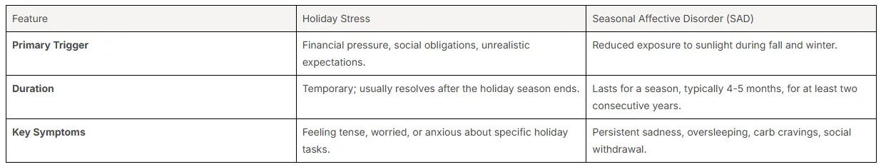 How can you tell if what you're feeling is temporary holiday stress or the more persistent Seasonal Affective Disorder? The main difference often lies in the duration and triggers of your symptoms. Holiday stress is typically tied to specific events like financial strain or social obligations and tends to lift after the New Year.
