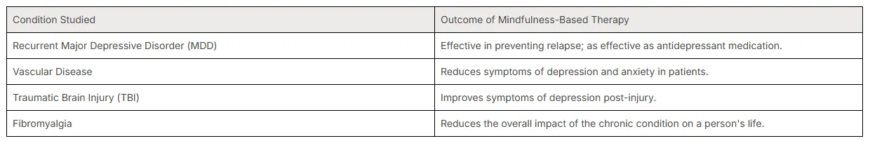 The findings from major studies apply universally, indicating that individuals in Houston can experience these same positive outcomes. The table below summarizes the effectiveness of mindfulness therapy on different conditions, as supported by research.