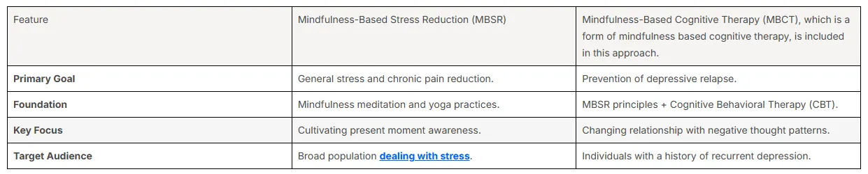 While closely related, Mindfulness-Based Cognitive Therapy (MBCT) and Mindfulness-Based Stress Reduction (MBSR) have distinct origins and applications. MBSR was developed by Jon Kabat-Zinn as a general program to help people manage stress and chronic pain, including those affected by substance abuse, using meditation and yoga. It focuses broadly on cultivating awareness in daily life.