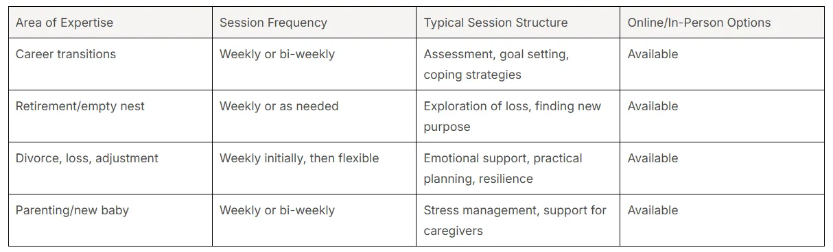 Your mental health professional will guide you through assessment, goal setting, and the development of coping strategies. The types of life transitions you’re experiencing will influence the session content—divorce, retirement, or job change may require different approaches.