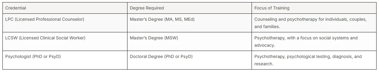Common licenses include Licensed Professional Counselor (LPC), Licensed Clinical Social Worker (LCSW), and Psychologist (PhD or PsyD). An LPC typically holds a master's degree in counseling, while an LCSW has a master's degree in social work. A psychologist holds a doctoral degree and is trained in psychological testing and research in addition to therapy.