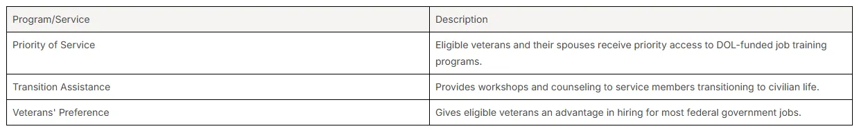 The U.S. Department of Labor (DOL) offers specialized employment and training services for military veterans through its Veterans' Employment and Training Service (VETS). The goal is to provide former members of the armed forces of the United States with the resources needed to find and maintain good jobs.